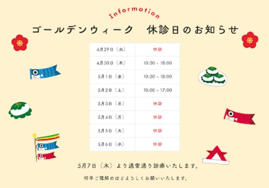 お知らせゴールデンウィーク中の診療日は以下の通りとなります。4/29(水):休診4/30(木):通常通り診療5/1(金):通常通り診療5/2(土):通常通り診療5/3(日):休診5/4(月):休診5/5(火):休診5/6(水):休診5/7(木)~:...